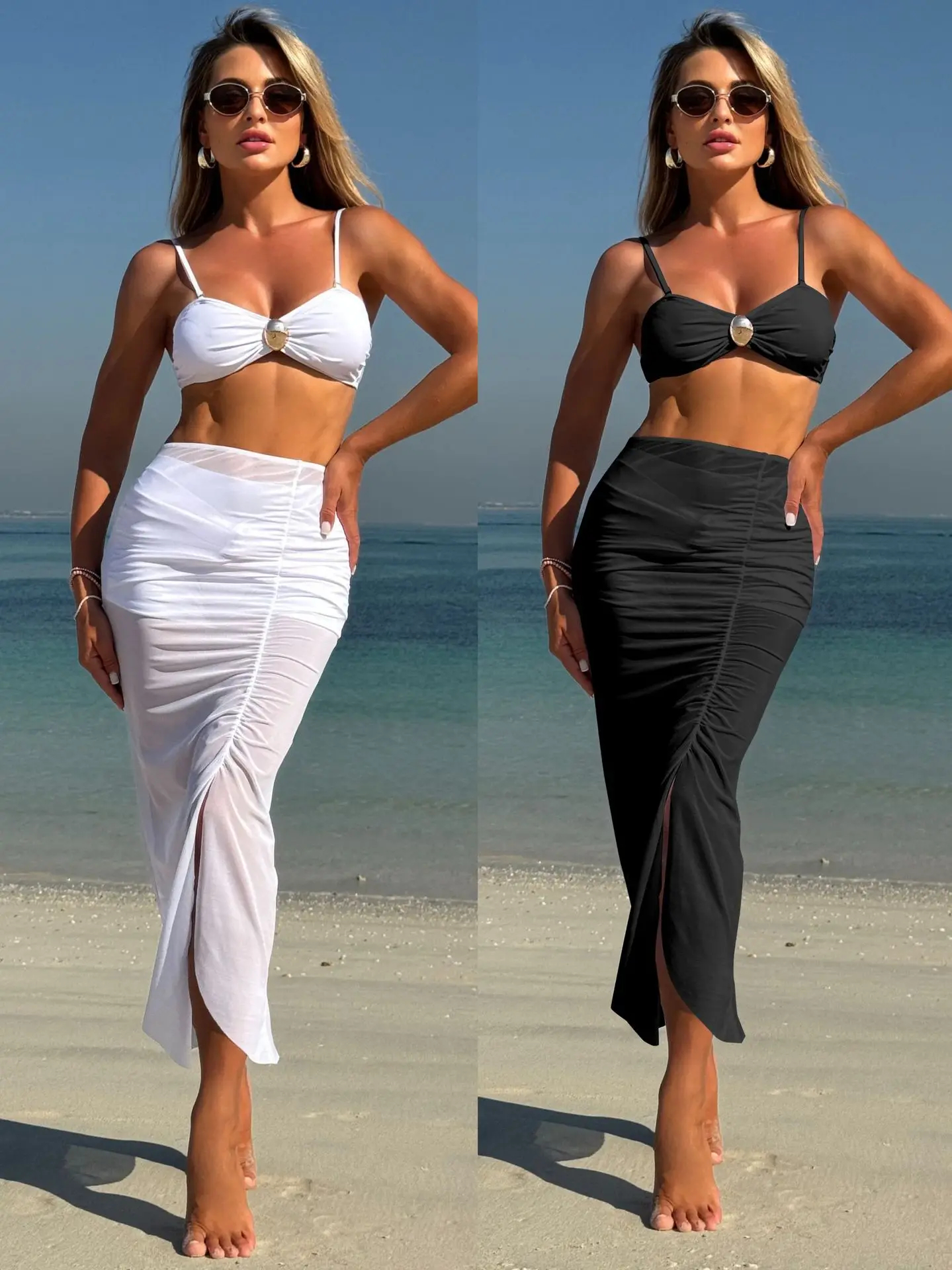 Sleek, flattering, and full of attitude — the 3-Piece Solid High-Waist Bikini Set with Skirt and Metal Ring Detail is your new summer essential. This ultra-stylish set includes a supportive bikini top, high-waisted bottoms that snatch the waist, and a matching mini skirt that takes your beach look to the next level.